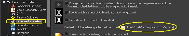 In Etere Configuration > Settings> Executive Editor > Schedule Parameters, in Global tab, a path must be defined for graphics and scenes objects repository.
