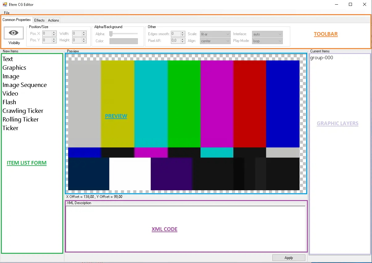 Etere ETX CG Editor allows you to work with ETX-G and create configurations with a friendly GUI. ETX CG Editor is currently based on Microsoft Windows Presentation Foundation (WPF), so the WPF Playlist Sample is included.