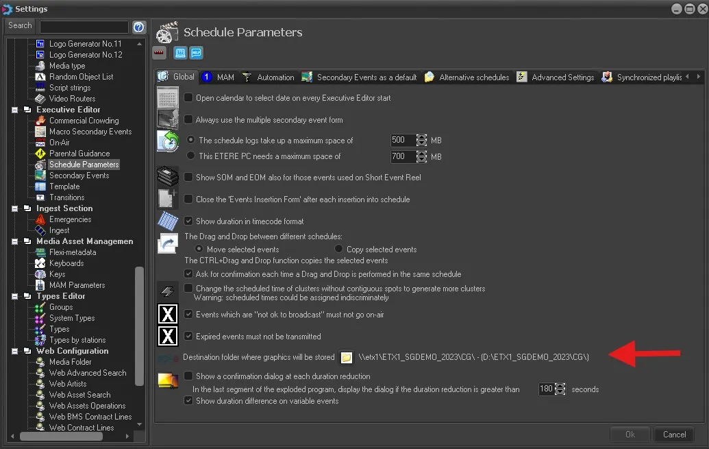 To correctly apply the transition (it will create a *.et-cgc file alongside the *.ml-cgc file, with same name), the "Destination folder where graphics will be stored" feature in Etere Configuration > Settings > Schedule Parameters > Global tab must be enabled and properly configured [please refer to related chapter 59.2.40.13 Global