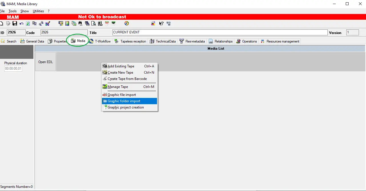 In the Media tab, right-click and select “Graphics Folder Import” to import the folder containing the “params.txt” file and the “CurrentEvent.ml-cgc” file created in the previous chapter.
