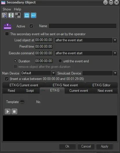 Once the ETX-G graphic objects have been imported and approved in the Media Library, you can start to schedule the templates as secondary events in the Executive Editor.