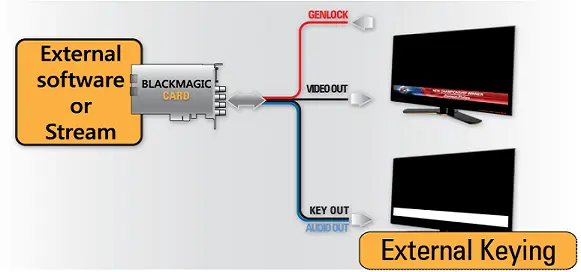 External Keying In external Keying mode, an external software or stream sets the Blackmagic card to generate video and key SDI signals; the Keying is made by an external keyer as a master switcher, as illustrated below.