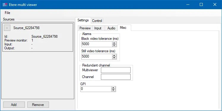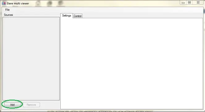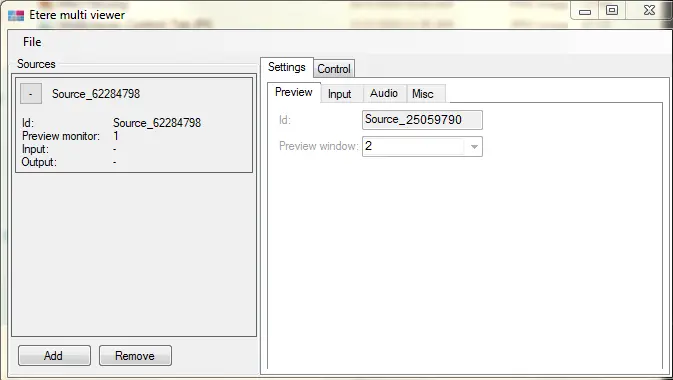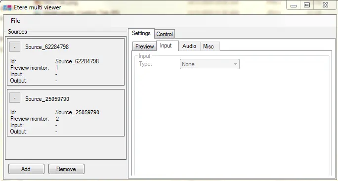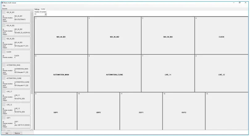 In the <Settings> tab, you can insert input source to Multiviewer by clicking on the <Add> button at the bottom panel.