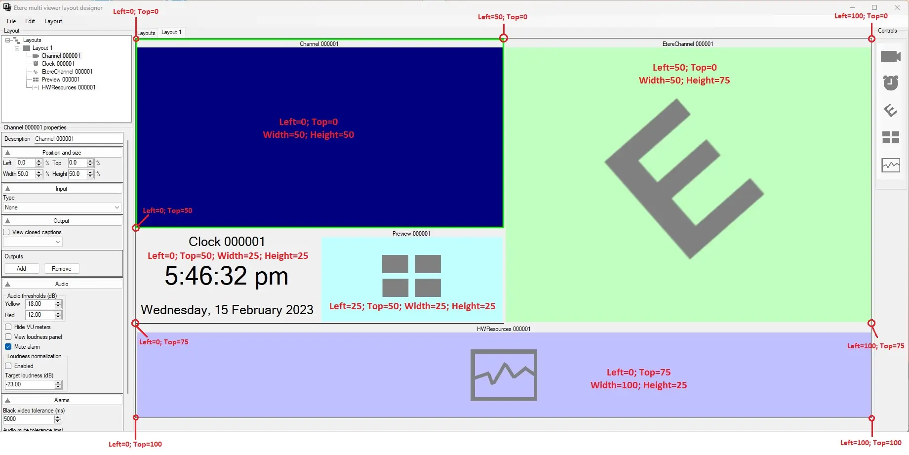 Differently from the size and position of layout area and layouts, when referred to Multiviewer controls, these 2 properties are expressed in percentage, as shown in the following image: