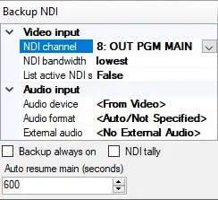 In case of NDI input is lost and replaced by the fault back NDI backup stream, the Auto resume main value defines a time interval after which signal returns to the main NDI input. A value of 0 disables this feature.