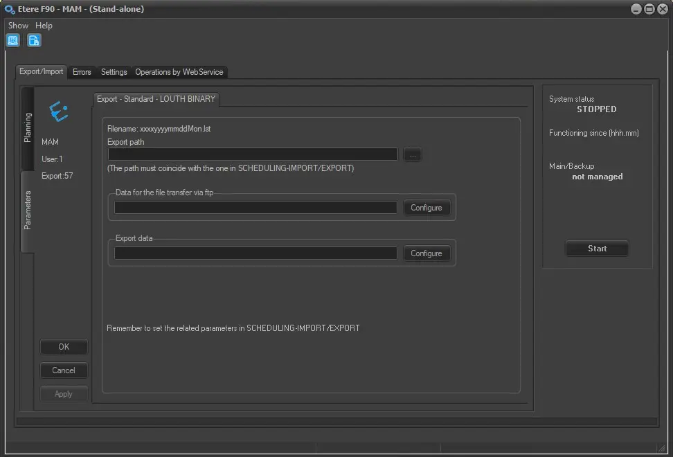 Set the same parameters in the Etere Scheduling > Import/Export > Imagine Binary and apply the changes once done.