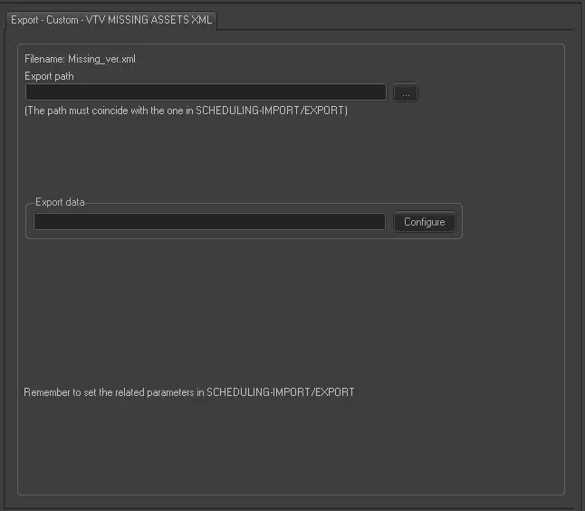 The Export_Custom_VTV_Missing_Assets_XML export a list of missing assets to an XML file.