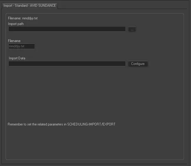 Set the same parameters in the Etere Scheduling > Import/Export > IMPORT\STANDARD\AVIDSUNDANCEPLAYLISTTXT and click <APPLY> to confirm the changes.