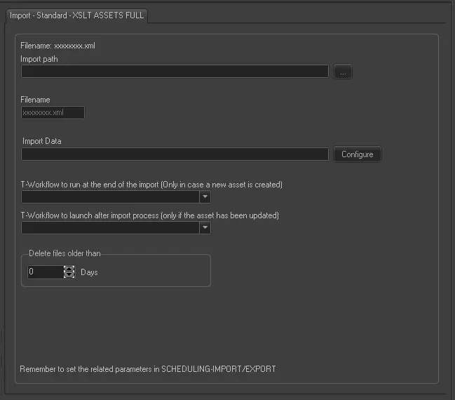 The F90 - XSLT Asset Full import allows to import standardized XML files containing the information related to assets of the specified day(s).