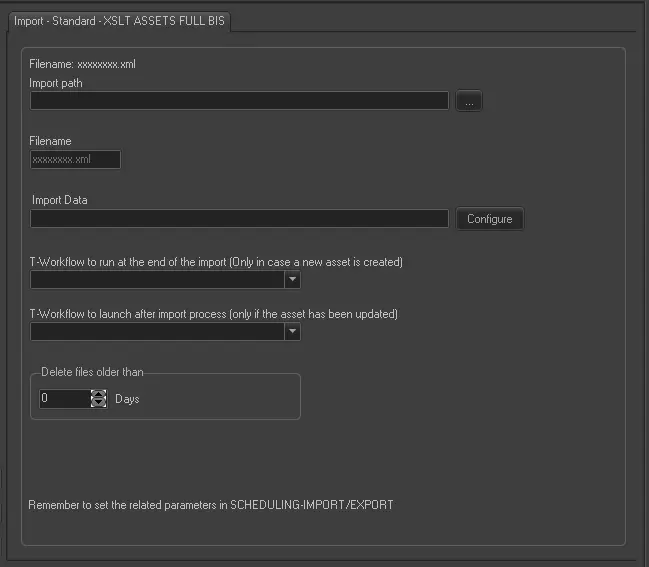 The F90 - XSLT Asset Full BIS, imports standardized XML files containing the information related to assets of the specified day(s). The import parameters are similar to F90 – XSLT Asset XSLT, it allows you to submit multiple instances of similar import through same channel.