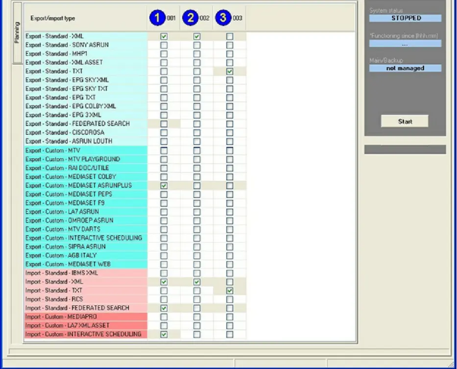 - The "Export/Import" tab allows to select all the operations intended to be performed by Etere F90.