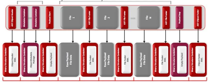 The AXF Object Footer contains the information of AXF Object Header plus information captured during the AXF object’s creation, checksums, precise file size and structure block positions. The AXF Object Footer is important to the resiliency of the AXF specification because it allows efficient re-indexing by foreign systems when the media content is not previously known, offering media transport between systems that follow the AXF specification.