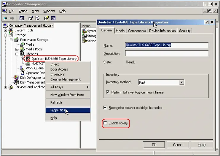 4. In order to avoid conflicts, it is suggested to deactivate the library under the Removable Storage windows service, by unchecking the 'Enable library' option under its properties: