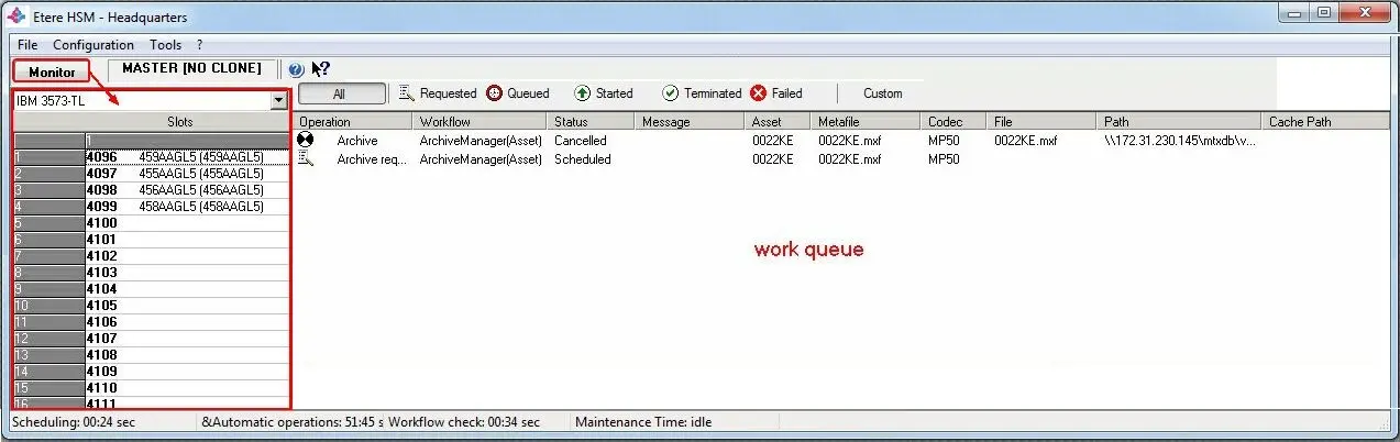 •Work Queue: View all the operations queued for being processed by Etere HSM, allowing also to manage them (e.g. refresh, cancel, delete, etc). Here are included those operations finished in error (i.e. backup or restore).