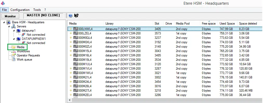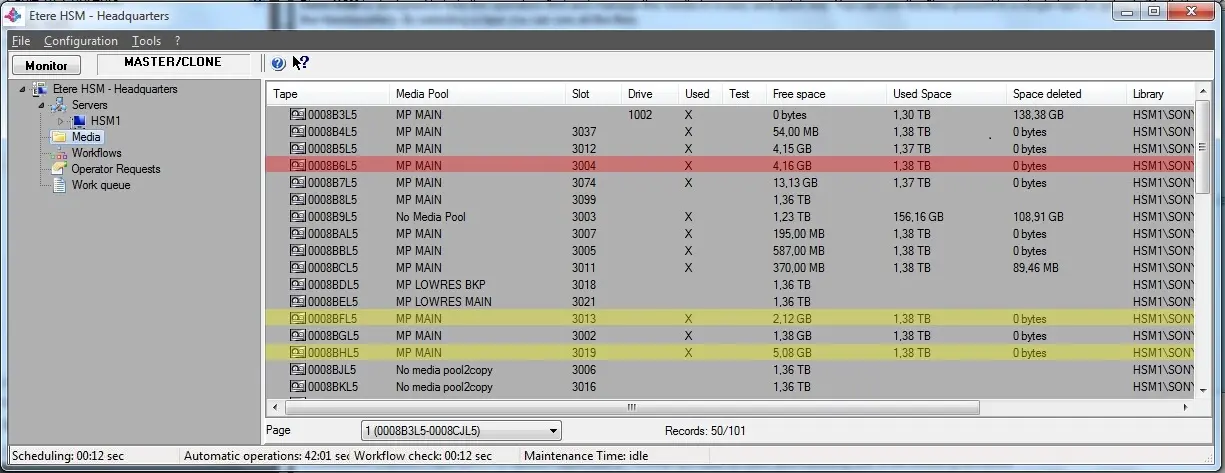 Etere HSM is designed to help the operators find and manage the media in a easy and quick way, it allows to view which files are present in a single tape. As shown in the image below, tapes displayed in this section are highlighted according to their status, a status that can be: