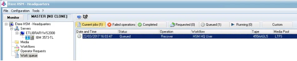 2.In Etere HSM – Headquarters > Work Queue, the recovery request has been scheduled in the job queue pending DataPump to perform the recovery process.