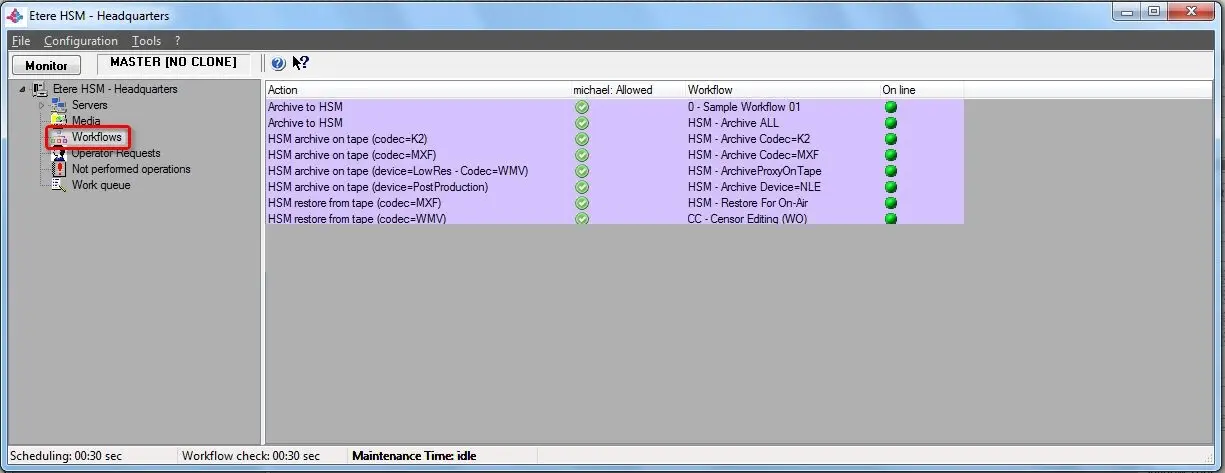 The "Workflows" section allows operators to have a list of all the HSM archive/restore actions currently available for being performed via T-workflow, detailing them with the following information: