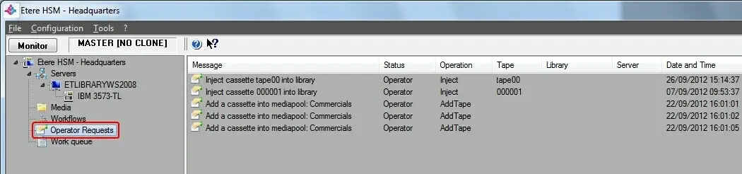 Under the Media section it will be shown all requested Etere HSM operations waiting for their related tape to be injected: