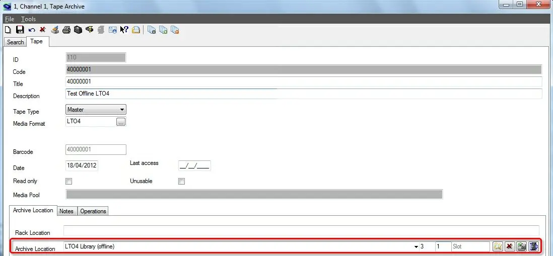 NB: Please note that in case the tape is online (i.e. not offline), the "archive location" field will be disabled and it won't be possible to modify it.