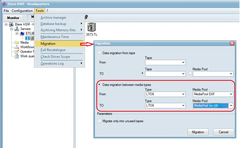•Library: The Etere HSM Robotics server will automatically command the library to load the required cartridge.