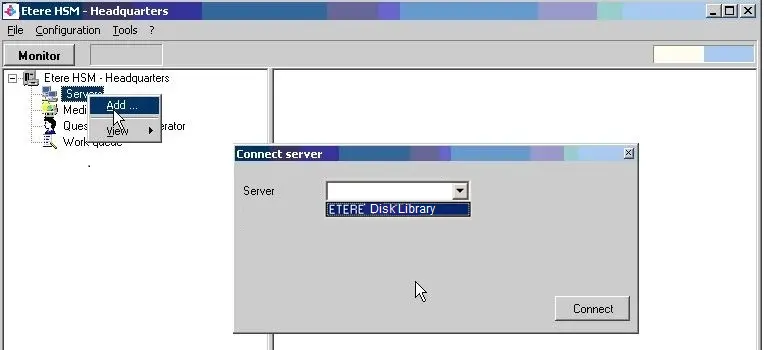 1. Launch HSM Headquarters from the monitor console right right-click Server in the Headquarters tree select “Add,” and select “Etere Disk Library” from the list.
