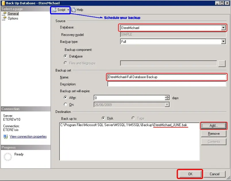 Instead, if you wish to schedule the just created 'database backup operation', select 'Script action to job' from the 'Script list', the next window will appear: