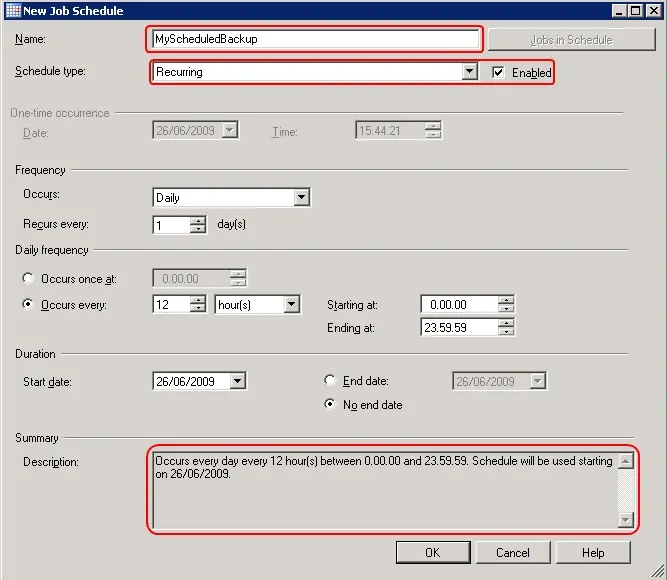 Go to the 'Schedules' section and click 'New'. In the 'Job Schedule' dialog box you will have to type the job name and specify the job schedule (type, frequency,duration, etc):