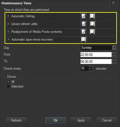 The Maintenance Time is a key tool that permits to automatically perform specific maintenance tasks with a certain user-defined time frequency. The main tool window permits operators to plan the most common tape library maintenance tasks according to a series of criteria based on the following parameters: