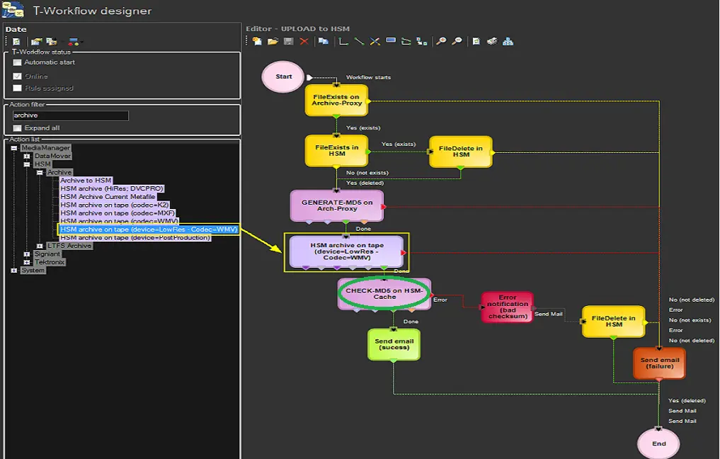 A user-defined T-workflow or template-based T-workflow must be in place to archive assets into HSM backup tapes. Etere provides some template-based T-workflow actions that cater for this purpose.