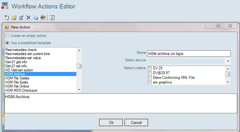 In the “HSM Archive” action, give a name (e.g. HSM archive on tape) to identify the action, and select the device and codecs to be used for archive operation.
