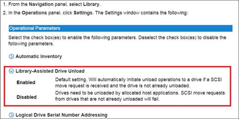 In LTO Tape Library manual, it revealed that the option “Library-Assisted Drive Unload” in Operations Parameters is likely the solution to the reported error.