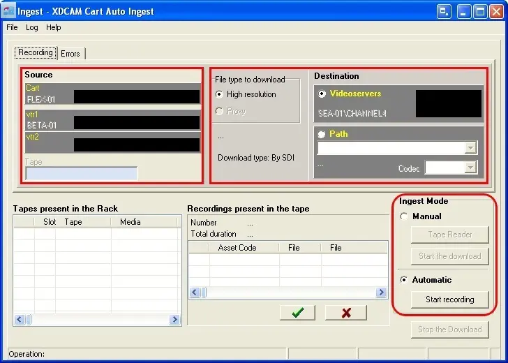4.By pressing the [Start recording] button, the application will automatically search for media on the configured Tape(s) and will download them on either the selected Video Server or Path, by using the configured XDCAM Cart.