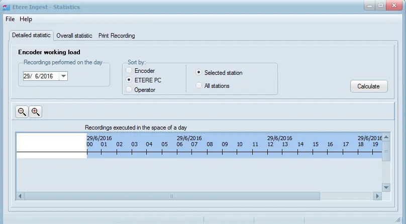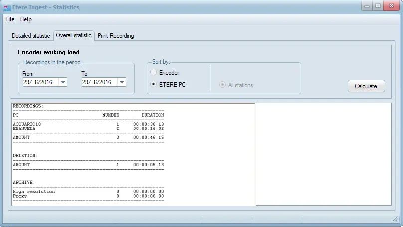 Allows one to have a report of all the ingests carried out during the selected day, or in a specific period of time, once you have opened the Statistics module, a new window will appear, allowing you to calculate both detailed and overall statistics: