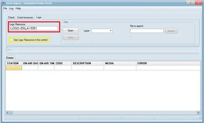 The selected logo resource is reflected in the Scheduled Media Check under the “Logo” tab, which you can start testing on the logo.