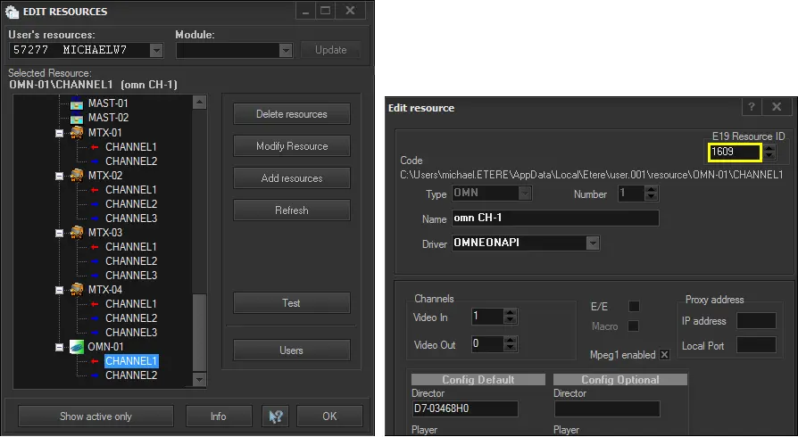 3. In "Etere Configuration > Resources" define the video server resource (e.g. OMN-01). Then, specify the resource ID (taken in the previous step) on each encoder and decoder channel: