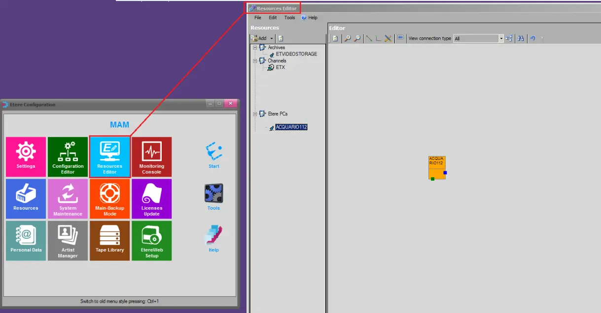 2. In "Etere Configuration > Resource Editor", define the video server resource (e.g. VS-Omneon) including encoder and decoder channels. Then,make sure the the video server channels are connected to a router resource: