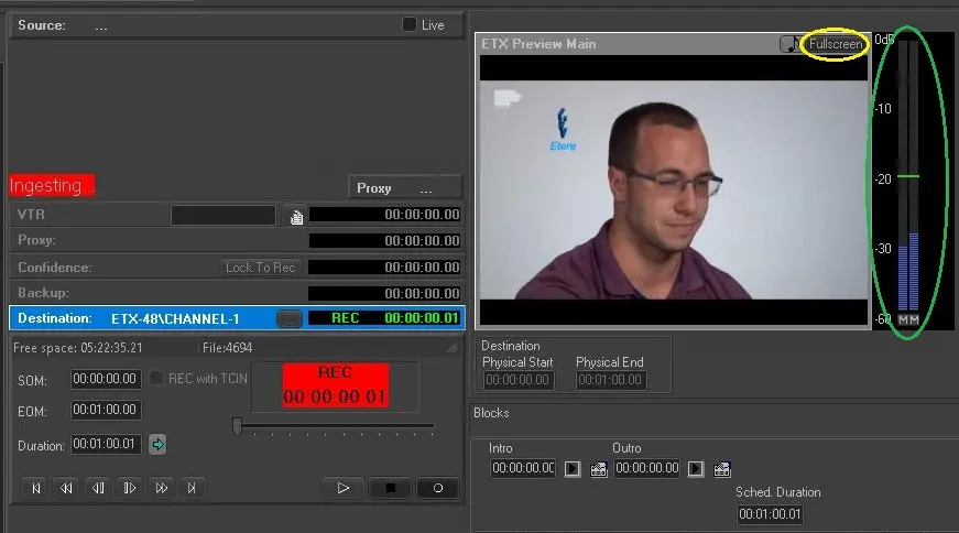 During the ETX Preview, besides hearing the audio from the audio channel, the audio level VU (volume unit) Meter are displayed in different color to indicate the audio volume level for reference (see image below). The volume indicators are also available during recording and Live input.