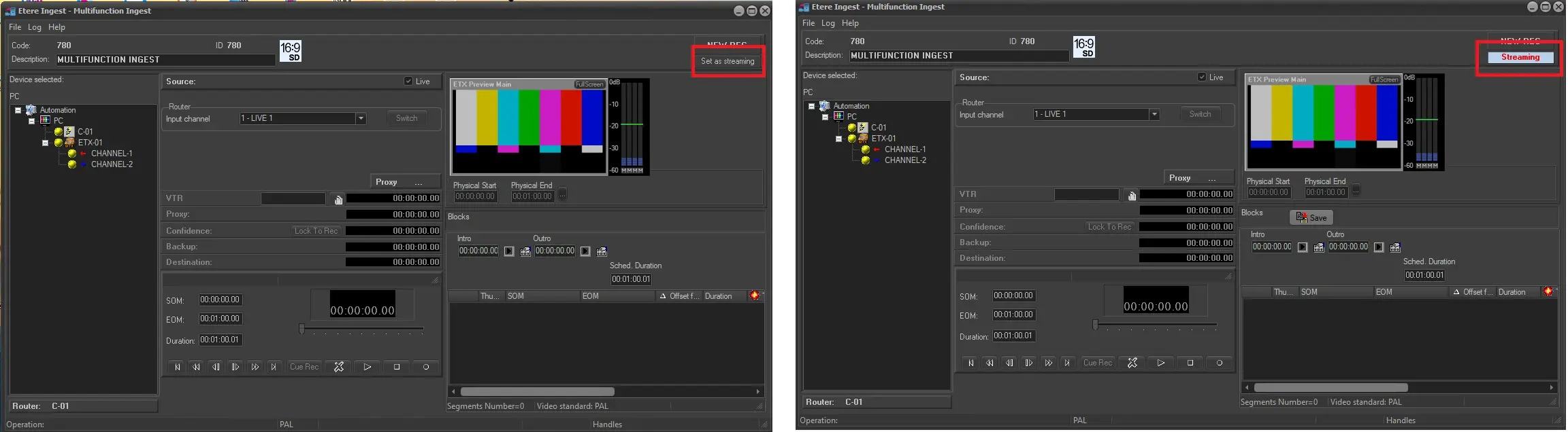 LIVE - In case you intend to ingest from a live router channel, you must select the channel from where acquire the video, press 'switch' and indicate the expected duration that can be extended up to the maximum double of the expected duration in 10 minute long passages.