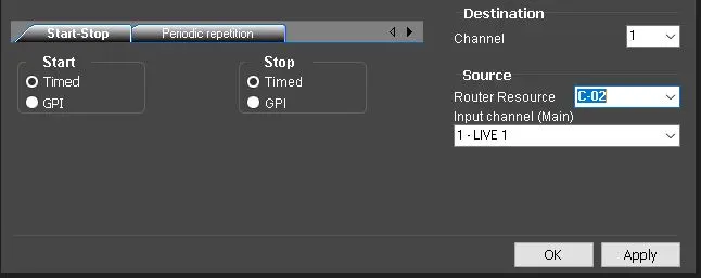 - If Start by GPI, it defines an interval of time for the reception of the GPI signal. This interval goes from the scheduled time minus the timeout to the scheduled time plus the timeout.