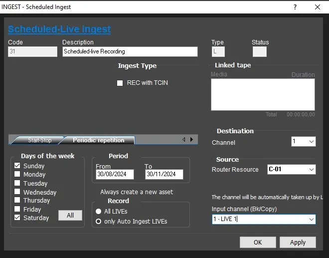 • All LIVEs: If enabled, all LIVE events present in the Schedule will be ingested (between the specified date range and on the specified days), and every new ingest operation will be associated with a new asset form with an asset code starting 'LR' (customizable under Config > Live Code Prefix), and it will show (on its description) key information taken from 'Live' ingest operation.