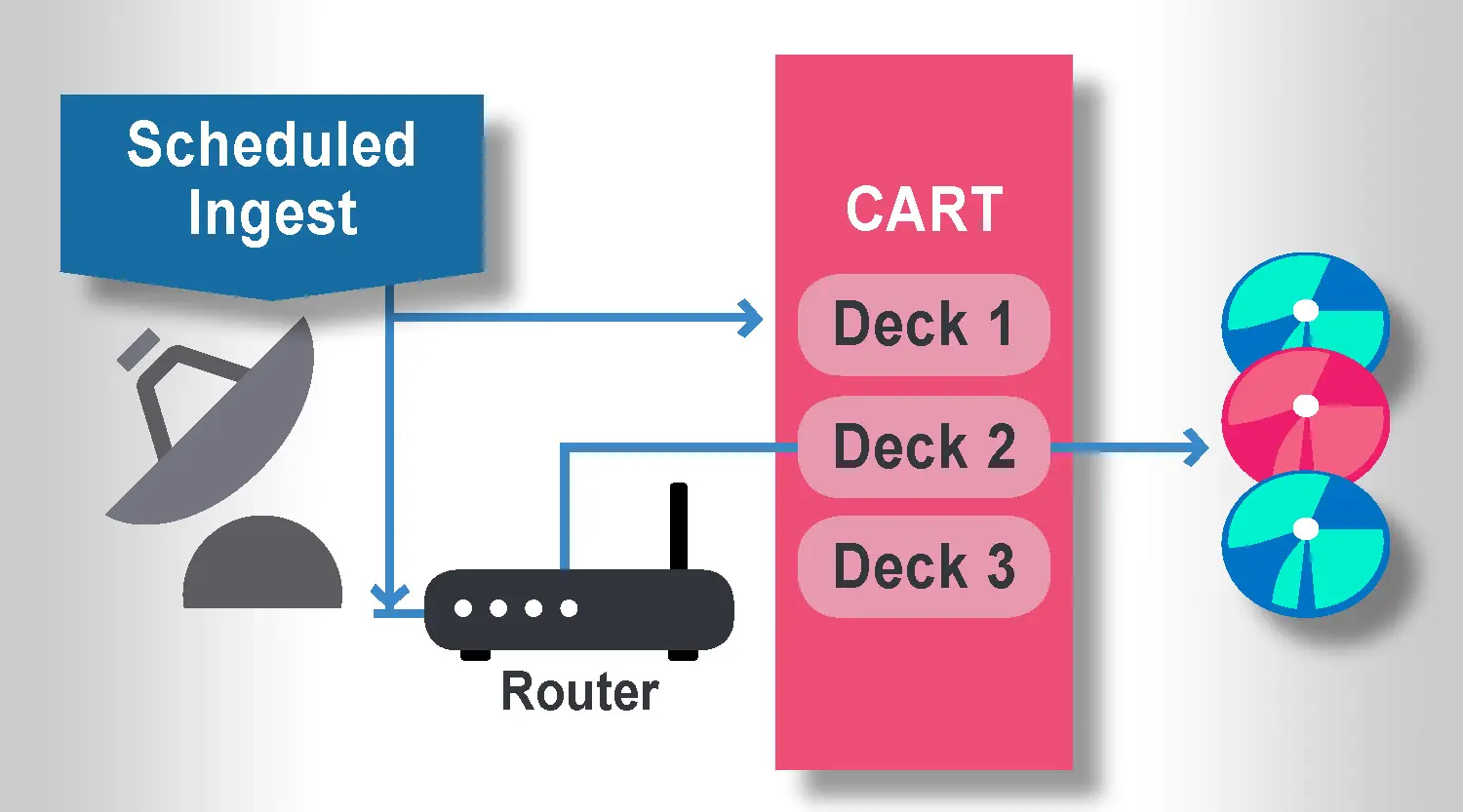 Disc 1 should be loaded onto Deck 1, Disc 2 onto Deck 2 etc. As mentioned previously, it usually takes approximately 30 seconds to load each disc into the respective deck and it is important to set the 'Timeout Scheduled Ingest (sec.)' parameters based on the number of decks to be used: 30 seconds for 1 Deck, 60 seconds for 2 decks, 90 seconds for 3 decks and 120 seconds for 4. These timeouts represent how many seconds before the scheduled start of the ingest operation, the discs will be moved from their slot into the cart.