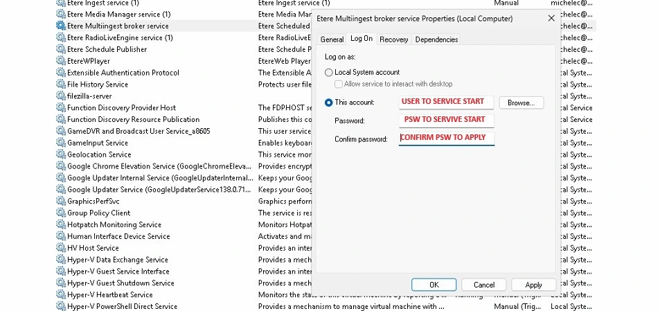 NOTE: In the latest versions of ETERE 36.1, the Multingest broker service will be able to manage all scheduled recordings for all channels/users (licensed), searching for all the various services installed in the various workstations.