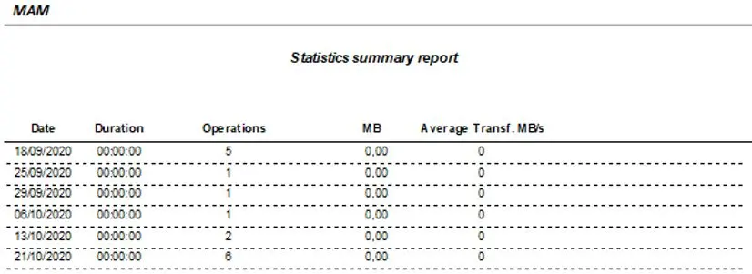 The Period1 and Period 2 will provide a list of the days on which the given filters are matched, each item of the list will indicate the data, duration, number, MB and Average MB/s of all matching operations within the period as well as the total number of operations and total transferred bytes: