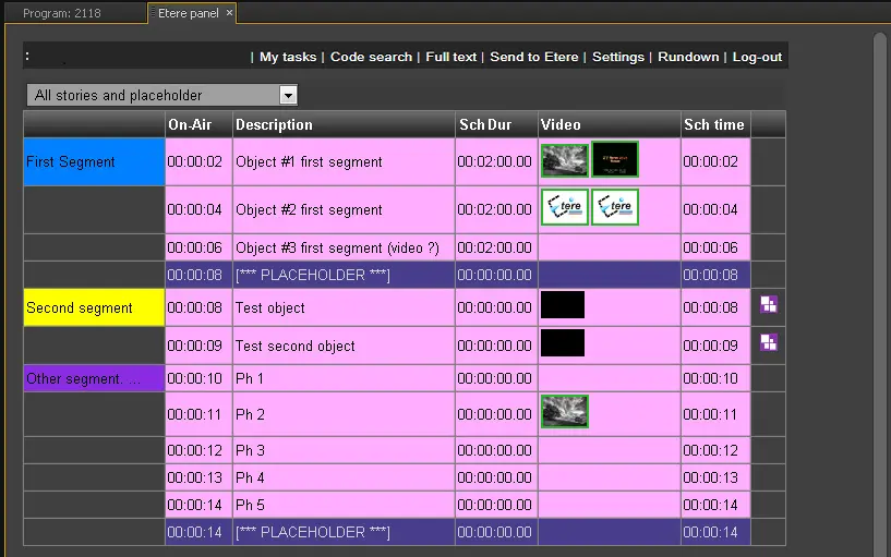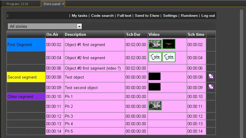 NB: Story's video objects with video but no thumbnail are displayed using the Etere logo.