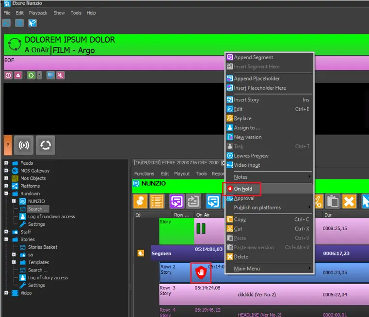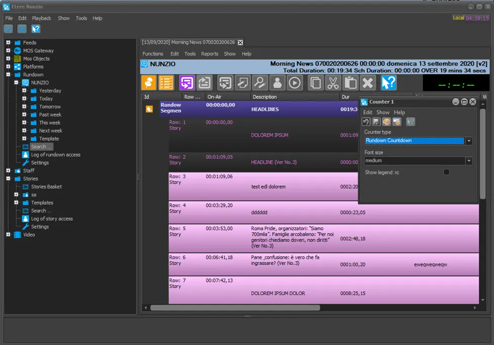 NB:The rundowns displayed in this section must be previously created and compiled in Etere Nunzio.