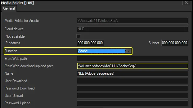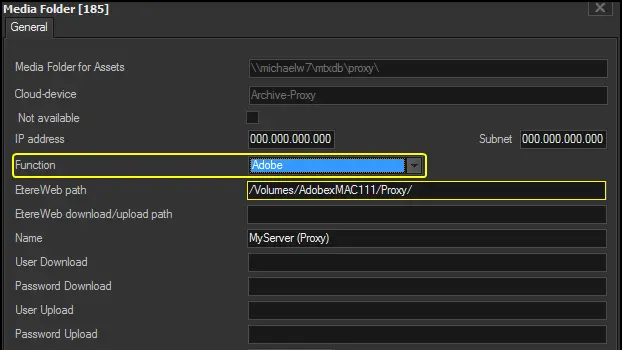 The folders intended to be utilized by Adobe clients (i.e. set in the Settings tab) must be correctly configured in "Etere Configuration > Settings > Web > Media Folders", this, depending on the operating system on which the client runs: