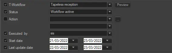 Workflow - Indicate the T-workflow to be used as the criteria to filtering retrieved assets. By pressing the 'Preview' button it display a graphical representation of the current selected T-workflow.