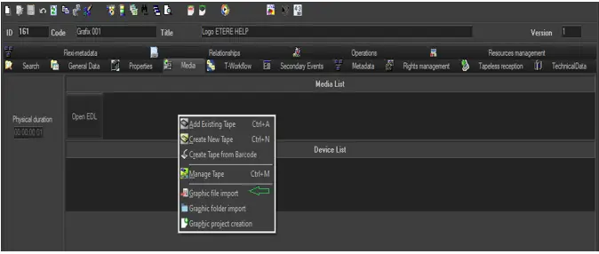 1.To import ETX graphic objects, launch Media Library module from the workstation where ETX-G is installed, from the Media tab, select “Graphic file import” from the contextual menu to import graphic objects.