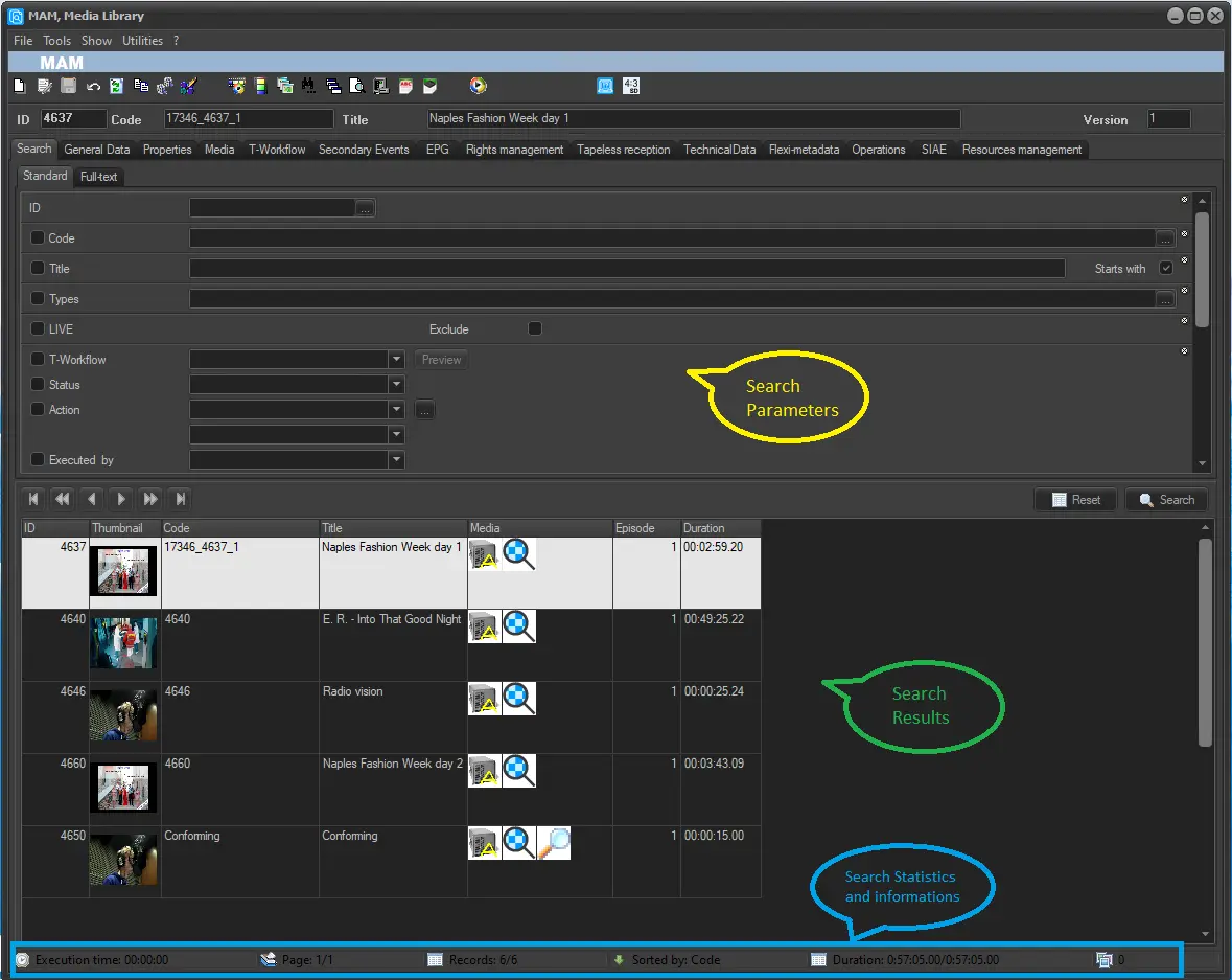 The 'searching' features provided by the Etere Media Library module are used by other Etere applications to improve the search, retrieval and selection of assets across the entire system, please refer to the Centralized Assets Selection chapter for more information about this feature.