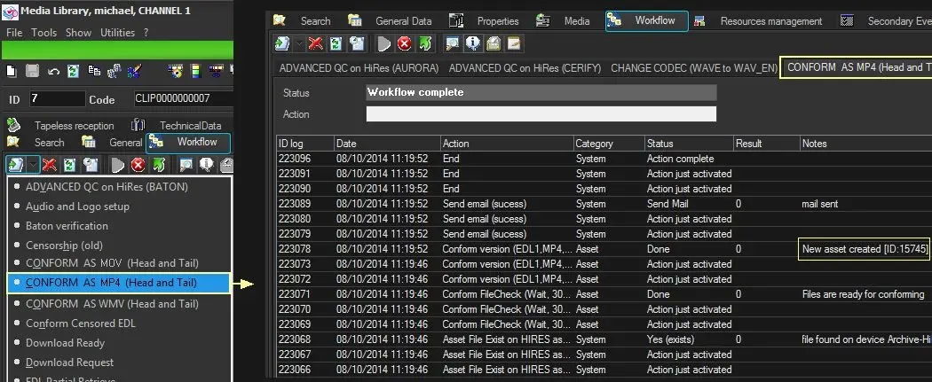Go to the "Media Library > Workflow" section, attach to the source asset the “version conforming” T-workflow and launch it: